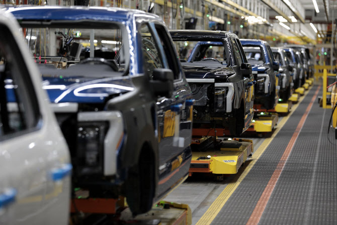 포드 모터 컴퍼니의 전기 픽업트럭 F-150 라이트닝이 2022년 9월 8일 미시간 주 디어본에 위치한 루즈 전기차 센터(Rouge Electric Vehicle Center)에서 생산 라인에 올라 있다. (사진=AFP) |