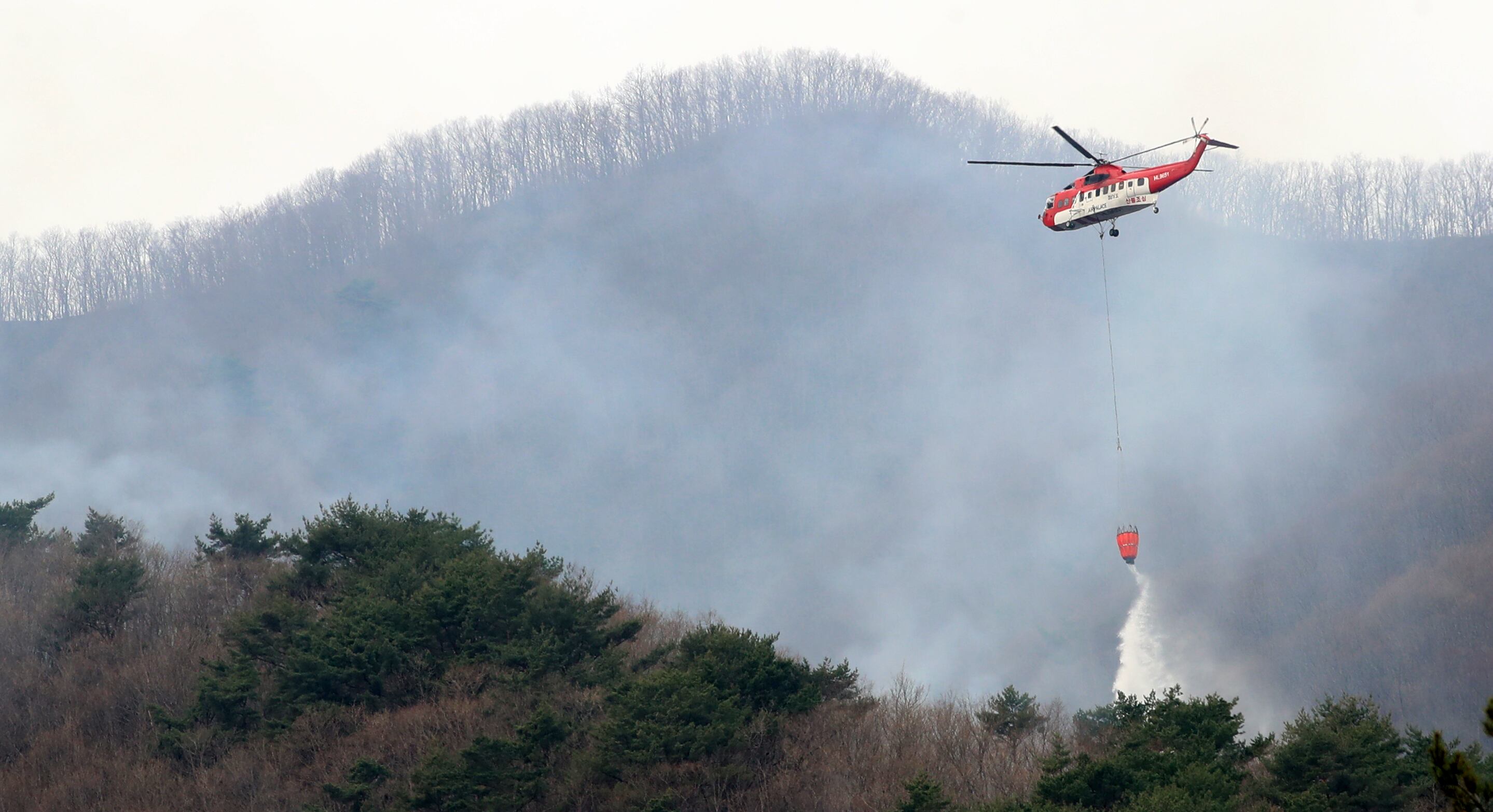 28일 오전 경남 산청군 삼장면 덕산사 인근에서 헬기가 산불 진화 작업을 벌이고 있다. /뉴스1 |