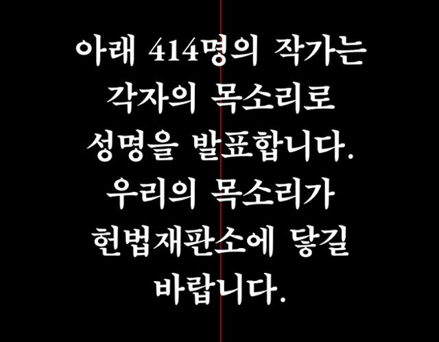 작가 414명이 쓴 414개의 성명이 25일 각 언론사 문학 담당 기자 메일함에 도착했습니다. 김혜순 시인, 한강 소설가, 백희나 그림책 작가, 미깡 만화가까지. 작가들이 세대와 장르를 불문하고 윤석열 대통령에 대한 헌법재판소의 탄핵 인용을 촉구하며 '한 줄 성명'을 낸 겁니다.
