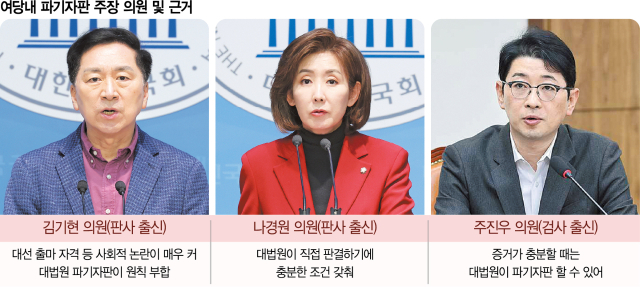 판사 출신인 김기현·나경원 국민의힘 의원은 이날 각각 기자회견을 열어 대법원을 향해 “사법부 신뢰를 회복하기 위해서라도 신속히 파기자판을 해달라”고 요구했다. 김 의원은 “이 사안은 쟁점이 매우 간단하고 기소부터 2심까지 30개월이 넘는 장기간에 걸쳐 사실심리가 이뤄졌으므로 추가적인 증거조사가 필요 없다”면서 “허위 사실 공표인지 여부에 대한 법리적 오류만 시정하면 된다. 파기자판 요건을 충분히 갖췄다”고 설명했다.