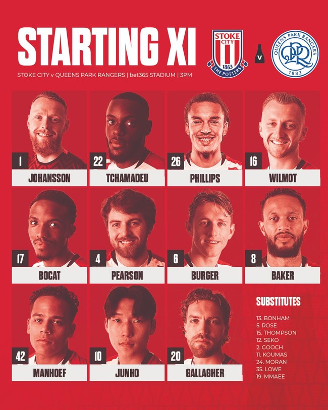 양 팀은 선발 라인업을 공개했다. 홈팀 스토크는 요한슨, 차마데우, 필립스, 윌모트, 보카트, 피어슨, 부르게르, 베이커, 맨호프, 배준호, 갤러거가 선발로 나선다.