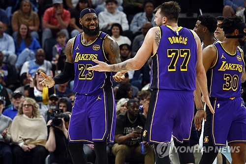 (서울=연합뉴스) 이의진 기자 = 루카 돈치치, 르브론 제임스, 오스틴 리브스가 85점을 합작한 미국프로농구(NBA) LA 레이커스가 멤피스 그리즐리스를 잡고 직전 경기 역전패의 아쉬움을 털어냈다.