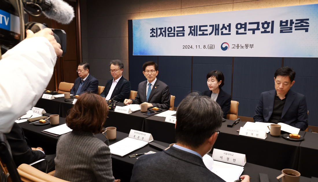 고용노동부가 지난해 11월 ‘최저임금 제도개선 연구회’를 발족했다고 밝혔다. 김문수 고용노동부 장관이 연구회에서 발언하고 있다. 연합뉴스 |