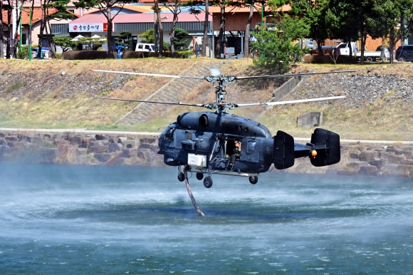 경남 산청 산불 발생 10일째를 맞은 30일 오전 산불진화헬기가 덕천강에서 물을 담수하고 있다. 2025.03.30. 뉴시스 |