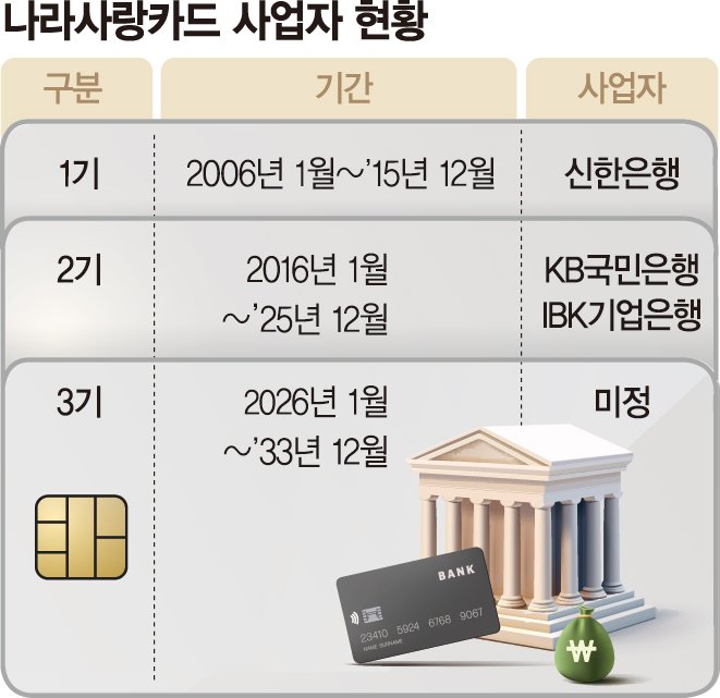[파이낸셜뉴스] 주요 시중은행과 지방은행 등 모두 9개 은행이 3기 나라사랑카드 사업자 선정에 뛰어들었다. 금융지주 소속 은행들 사이에 치열한 경쟁이 벌어질 전망이다. 카카오뱅크 등 플랫폼 경쟁력을 갖춘 인터넷전문은행도 참전 여부를 검토했지만 최종적으로 불참을 결정했다.