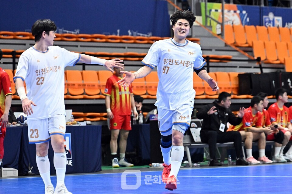 인천도시공사 진유성이 득점 후 하이파이브를 하고 있다 / 사진제공=한국핸드볼연맹 |