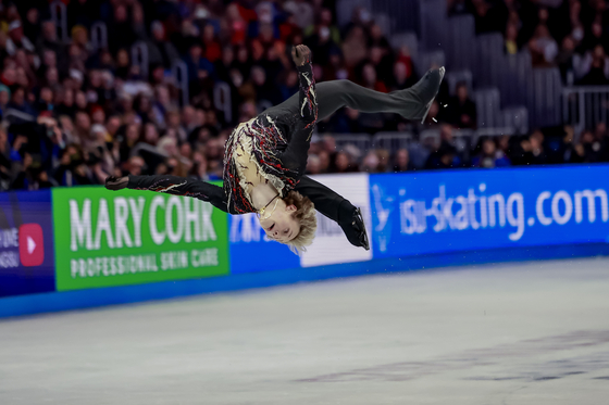‘디펜딩 챔피언’ 일리야 말리닌(21·미국)이 국제빙상경기연맹(ISU) 피겨 세계선수권대회에서 2년 연속으로 정상에 섰다. 말리닌은 30일(한국시간) 미국 보스턴에서 열린 대회 남자 싱글 프리스케이팅에서 208.15점을 받아, 쇼트프로그램(110.41점)을 합쳐 총점 318.56점으로 우승했다. 2위 미하일 샤이도로프(21·카자흐스탄, 총점 287.47점)에 31.09점이나 앞섰다. 말리닌은 피겨 역사상 쿼드러플 악셀 점프(4회전 반)를 뛴 유일한 선수다. 이날도 프리스케이팅에서 두 번째 점프로 완벽하게 뛰었다. 쇼트프로그램 10위(86.41점)였던 차준환(24)은 프리스케이팅에서 179.33점을 받아 총점 265.74점으로 7위에 올랐다. 2026 밀라노-코르티나 담페초 동계올림픽의 국가별 출전권이 걸린 이번 대회에서 한국은 여자 싱글 2장, 남자 싱글 1장(올림픽 예선서 1장 추가 가능), 아이스댄스 1장 등 4장을 확보했다. 전날 끝난 여자 싱글에서는 이해인(20)이 9위, 김채연(19)이 10위에 올랐다. 사진은 프리스케이팅에서 백플립을 선보이는 말리닌. [EPA=연합뉴스]