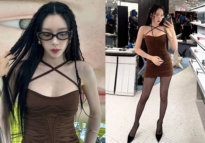 공개된 사진 속 태연은 브라운 컬러의 크로스 스트랩 셔링 미니드레스를 착용해, 목선을 타고 흐르는 얇은 스트랩과 타이트한 실루엣으로 고급스러운 섹시미를 극대화했다. 시스루 블랙 타이츠와 스틸레토 힐을 더한 룩은 단아하면서도 강렬한 인상을 남겼다.
