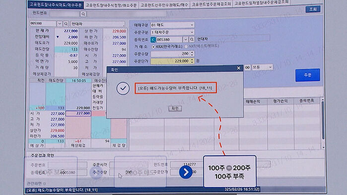 기관 투자자가 주식을 빌리지 않은 상태에서 주문을 내자, 오류 메시지가 뜨며 거래가 이뤄지지 않습니다.