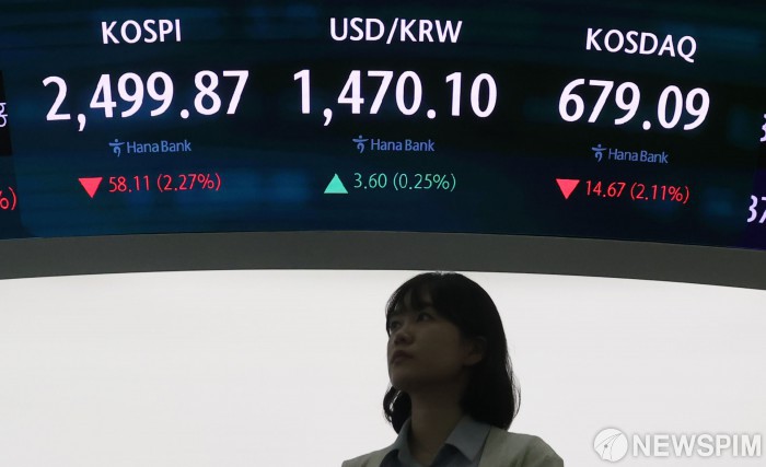 [서울=뉴스핌] 양윤모 기자 = 주식 공매도가 17개월 만에 재개된 31일 오전 코스피 지수가 전 거래일 종가보다 58.11포인트(2.27%) 내린 2,499.87로, 코스닥 지수는 14.67포인트(2.11%) 내린 679.09로 거래를 시작했다. 서울 외환시장에서 원/달러 환율은 전 거래일보다 3.60원 오른 1,470.10원에 거래되는 가운데, 서울 중구 하나은행 딜링룸에서 직원들이 업무를 보고 있다. 2025.03.31 yym58@newspim.com