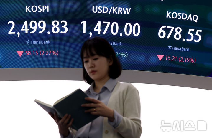 [서울=뉴시스] 김진아 기자 = 공매도 재개 첫날인 31일 서울 중구 하나은행 딜링룸에서 딜러들이 업무를 보고 있다. 코스피는 전 거래일(2557.98)보다 44.54포인트(1.74%) 내린 2513.44에, 코스닥 지수는 전 거래일(693.76)보다 10.34포인트(1.49%) 하락한 683.42에 거래를 시작했다. 서울 외환시장에서 원·달러 환율은 전 거래일 주간거래 종가(1466.5원)보다 4.1원 오른 1470.6원에 출발했다. 2025.03.31. bluesoda@newsis.com |