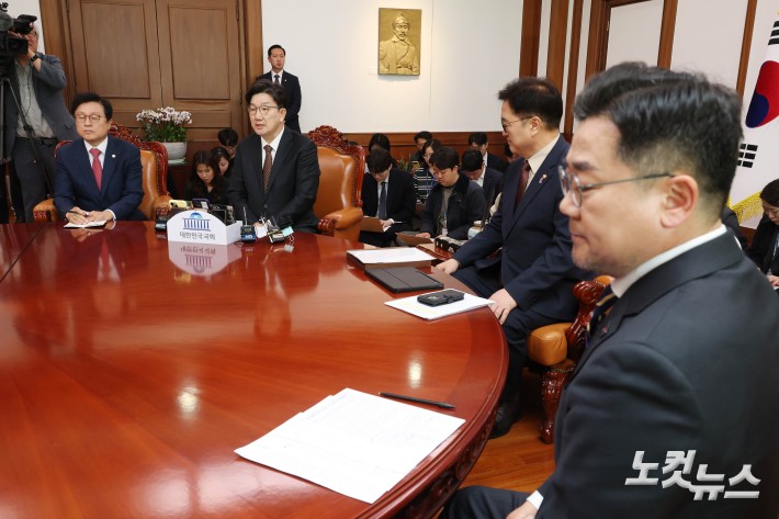 국민의힘 권성동 원내대표(왼쪽 두번째)가 31일 오전 국회에서 열린 국회의장 주재 여야 원내대표 회동에서 발언하고 있다.