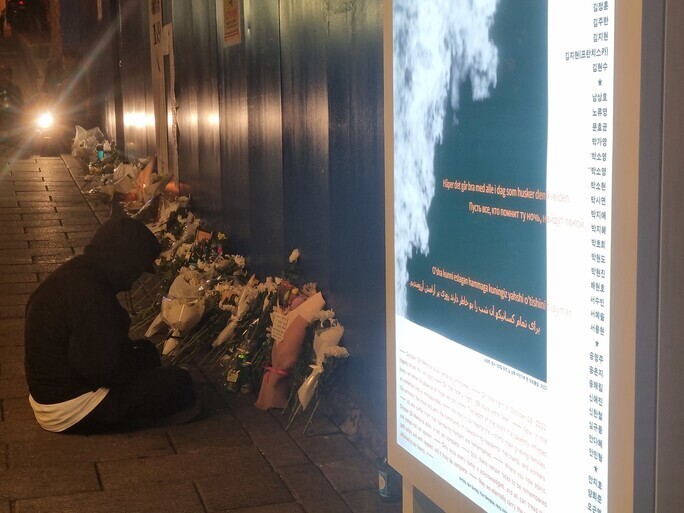 이태원 참사 2주기인 지난해 10월 29일 저녁 한 시민이 서울 용산구 이태원역 1번 출구 인근 ‘기억과 안전의 길’에 앉아 참사 희생자들을 추모하고 있다. 고나린 기자 |