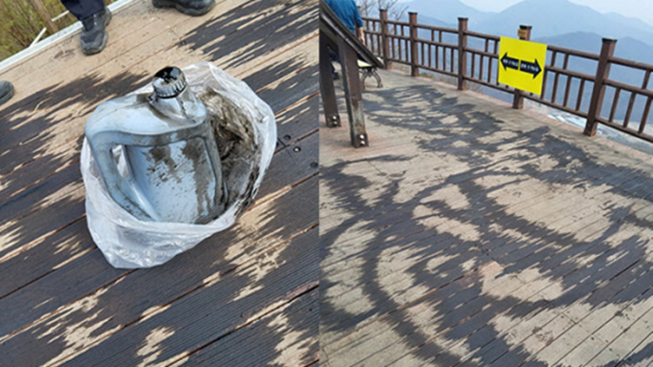 A씨는 지난 21일 오전 7시 50분쯤 화성시 비봉면 태행산 정상 데크 바닥에 자동차 엔진에서 나온 폐오일을 뿌린 혐의를 받는다.