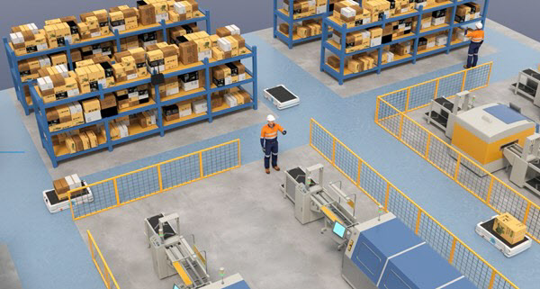 물류 공장 내 무인 로봇 자동화가 적용된 가상 시뮬레이션 이미지 (사진=카네비모빌리티) |