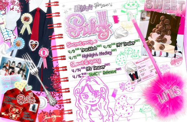 공개된 스케줄러 속에는 핑크색 레시피북 위로 '스위시' 프로모션 일정이 빼곡하게 담겨 있다. 이와 함께 유니스의 영한 에너지와 키치한 무드를 극대화하듯 교복, 학생증, 쿠키, 포크 등으로 아기자기하게 꾸며진 디자인이 눈길을 끈다.