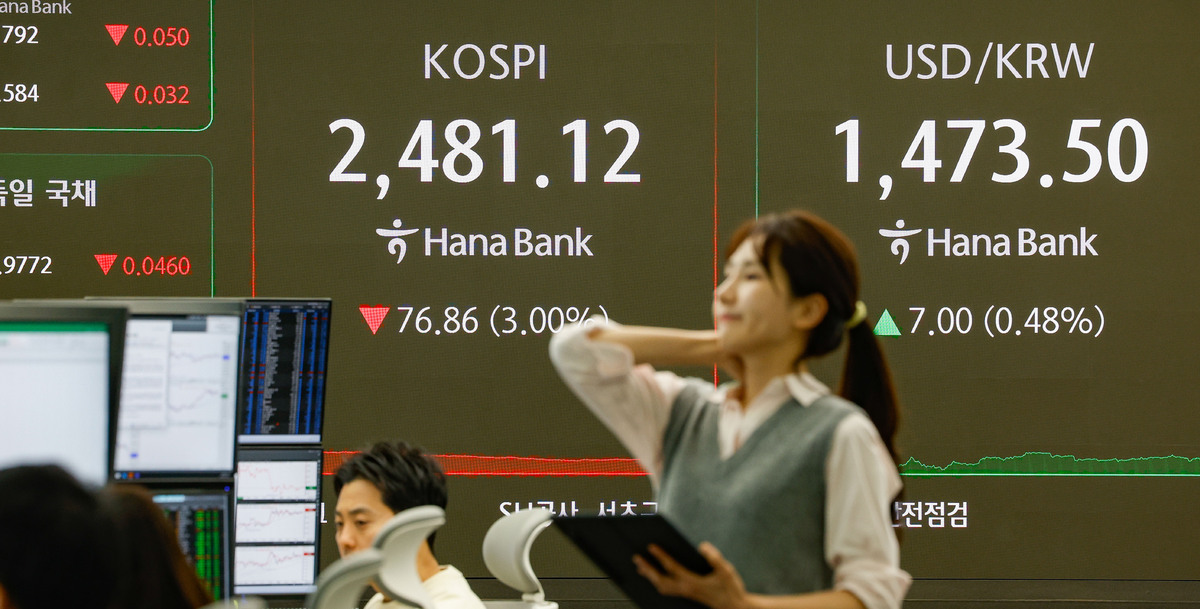코스피 2481 마감… 전 영업일 대비 3% 하락 공매도 재개 첫날인 31일 서울 중구 하나은행 본점 딜링룸 현황판에 코스피 종가가 표시되고 있다. 이날 코스피 지수는 미국 상호관세 공포에 공매도 재개 경계감까지 겹치며 76.86포인트 내린 2481.12로, 코스닥 지수는 20.91포인트 내린 672.85로 각각 마감했다. 최상수 기자 |