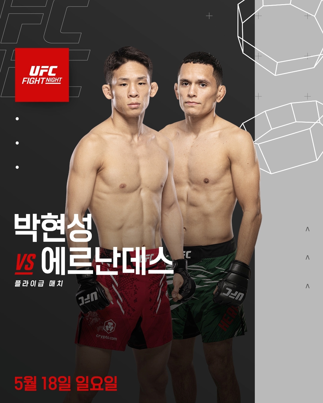 ROAD TO UFC(RTU) 시즌1 플라이급(56.7㎏) 우승자 박현성은 오는 5월18일(한국 시간) 미국 네바다주 라스베이거스 UFC 에이펙스에서 열리는 ‘UFC 파이트 나이트 베가스 106’ 대회에서 카를로스 에르난데스와 맞붙는다.