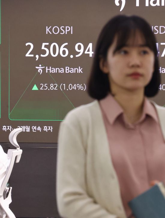 1일 오전 서울 중구 하나은행 본점 딜링룸 현황판에 코스피가 표시돼 있다. 이날 코스피는 전장보다 30.12p(1.21%) 오른 2511.24로 출발했다. 연합뉴스 |