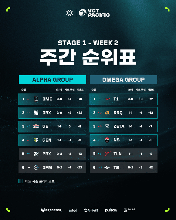 2024년 VCT 퍼시픽 스테이지 2부터 올해 열린 VCT 퍼시픽 킥오프의 모든 경기를 풀 세트 접전으로 치렀고 지난 주에 열린 제타 디비전과의 대결 또한 2대1로 승리하면서 VCT 퍼시픽 기준 11경기 연속 풀 세트 접전을 펼쳤던 T1은 자체 기록을 스스로 끊어냈다. 2연승을 내달린 T1은 오메가 그룹 1위로 뛰어올랐다.
