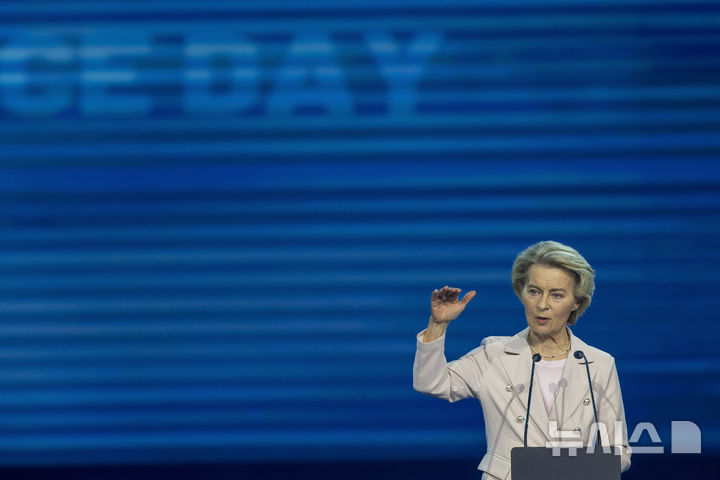 [빌뉴스(리투아니아)=AP/뉴시스]우르줄라 폰 데어 레이엔 유럽연합(EU) 집행위원장이 9일 리투아니아 빌뉴스에서 발트 에너지 독립 기념일에 맞춘 EU 전기 시스템 활성화 기념식에서 연설하고 있다. 그녀는 미국의 관세 부과를 하루 앞둔 1일 "EU는 트럼프 미 행정부의 새로운 관세에 대처하는데 있어 많은 카드를 쥐고 있으며, 강제로 보복할 좋은 계획을 가지고 있다"고 미국에 경고했다. 2025.04.01. |