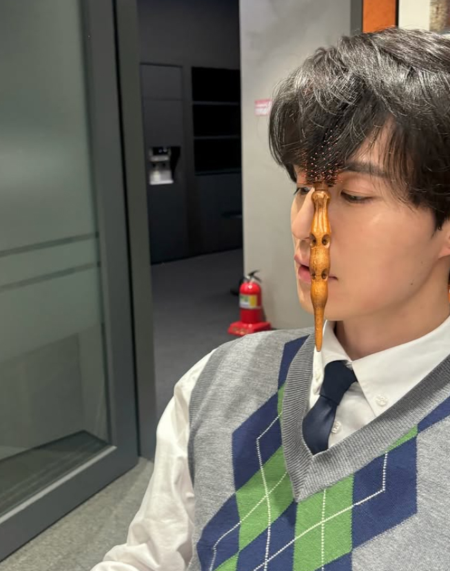 특히, 머리빗을 앞머리에 꽂고 앉아 있는 장면이 웃음을 자아낸다.