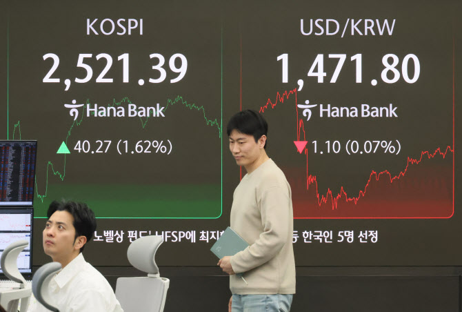 1일 서울 중구 하나은행 본점 딜링룸 현황판에 코스피 종가와 원/달러 환율이 표시돼 있다.(사진=연합뉴스) |