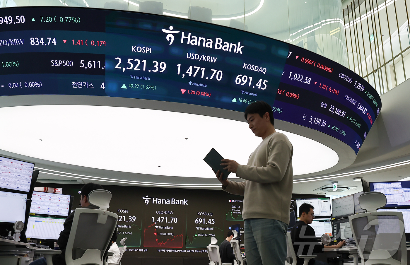 서울 중구 하나은행 본점 딜링룸 전광판./뉴스1 ⓒ News1 김도우 기자 |