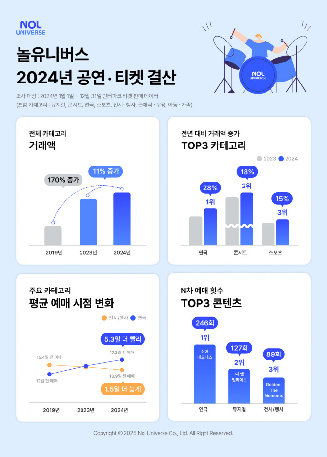 놀유니버스는 지난해 인터파크 티켓을 통해 집계된 공연·티켓 판매 데이터를 분석한 결과, 전체 거래액이 전년 대비 11% 증가했다고 2일 밝혔다.