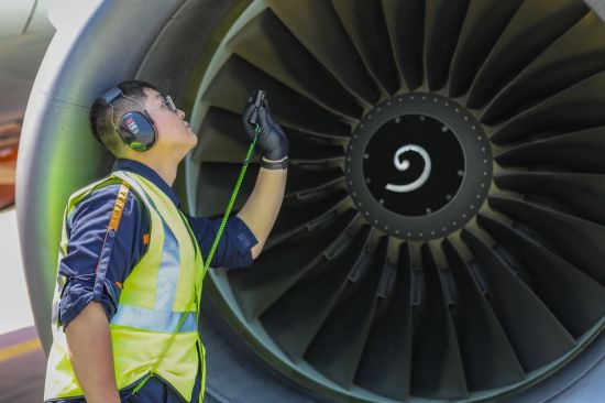제주항공 직원이 항공기 엔진을 점검하고 있다. 제주항공 제공 |