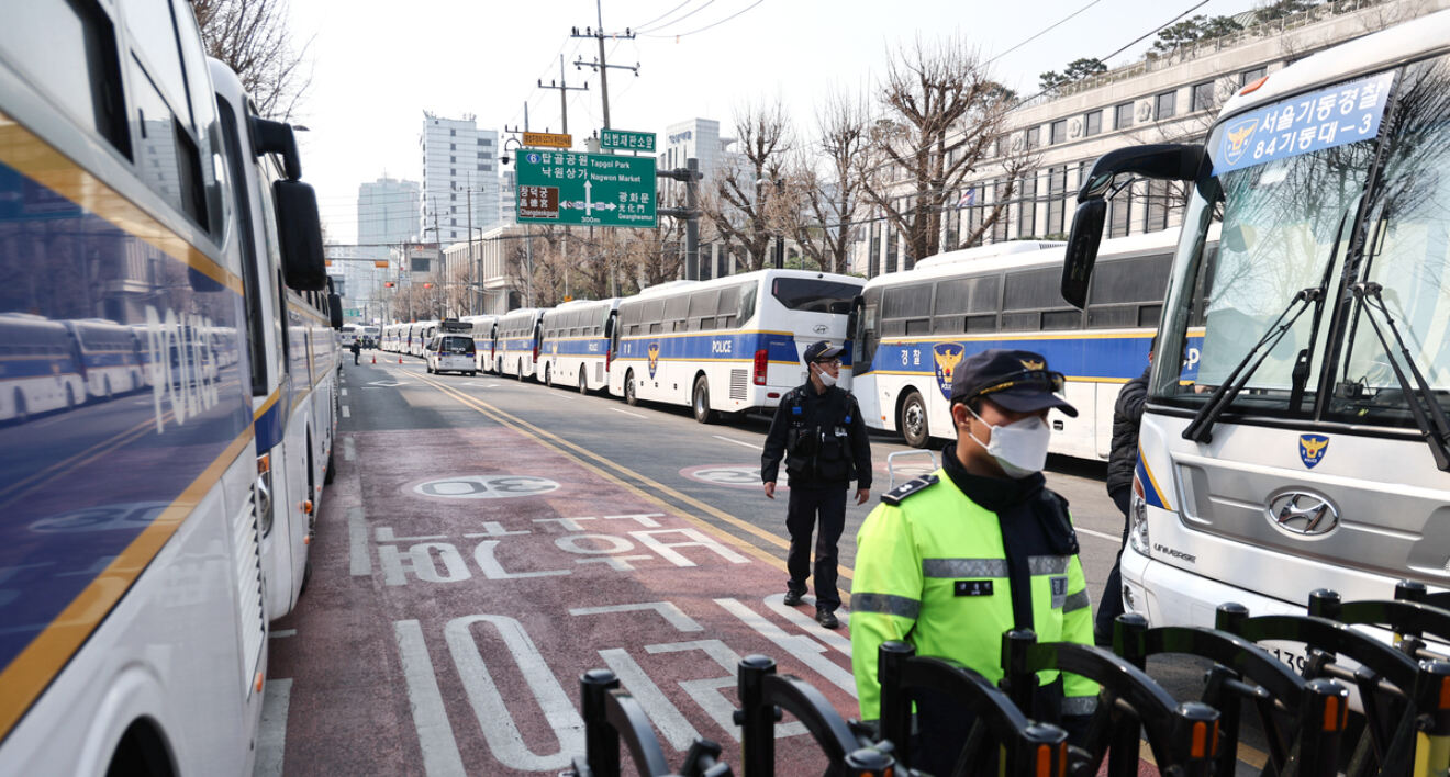 윤석열 대통령 탄핵 선고를 이틀 앞둔 2일 경찰이 서울 종로구 헌법재판소 인근 도로를 차벽 등을 이용해 통제하고 있다. 연합뉴스 |