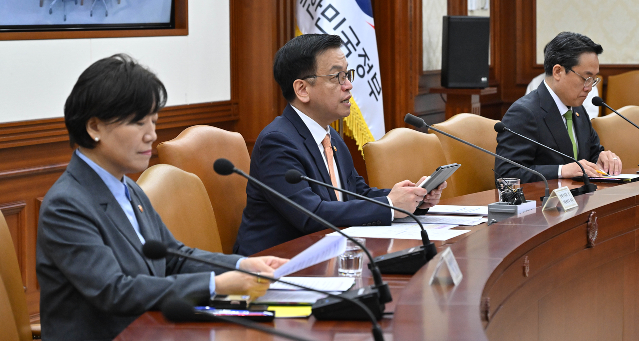 최상목(가운데) 경제부총리 겸 기획재정부 장관이 2일 오전 서울 종로구 정부서울청사에서 열린 경제관계장관회의에서 모두발언을 하고 있다. 임세준 기자 |