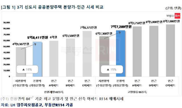 다만 치솟은 분양가에도 불구하고 지역 내 입주 5년 이하 신축 아파트와의 시세차익은 여전히 존재했다. 인천계양 A2블록 전용 84㎡ 확정분양가는 5억 8411만 원이지만, 분양시점(2024년 10월) 기준 인근 신축 아파트 전용 84㎡ 매매시세는 ▲계양하늘채파크포레 6억 원(2023년 입주) ▲계양효성해링턴플레이스 6억 3500만 원(2021년 입주) △힐스테이트자이계양 7억 6375만 원(2024년 입주)으로 최소 2000만 원에서 1억 8000만 원까지 차이가 났다.