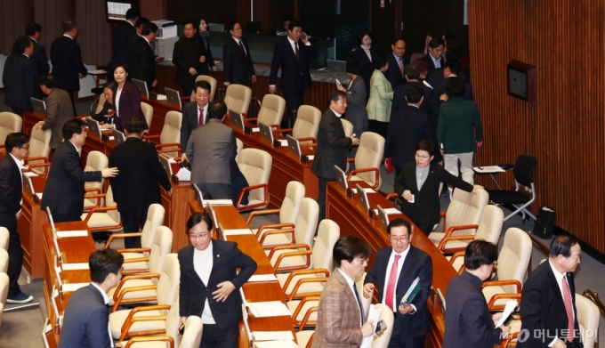 20일 오후 서울 여의도 국회에서 열린 제423회국회(임시회) 제2차 본회의에서 국민의힘 의원들이 퇴장하고 있다. 2025.3.20/뉴스1 Copyright (C) 뉴스1. All rights reserved. 무단 전재 및 재배포, AI학습 이용 금지. /사진=(서울=뉴스1) 김민지 기자 |