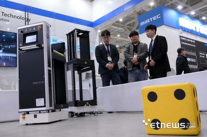 2025 스마트 SMT&PCB 어셈블리가 2일 경기 수원컨벤션센터에서 열렸다. 반도체 패키징과 자동화 시스템을 통합한 다양한 제조 솔루션을 선보였다. 파멕스 부스에서 관람객이 반도체 제조 공장에서 사용되는 자율주행 운반 로봇을 살펴보고 있다.