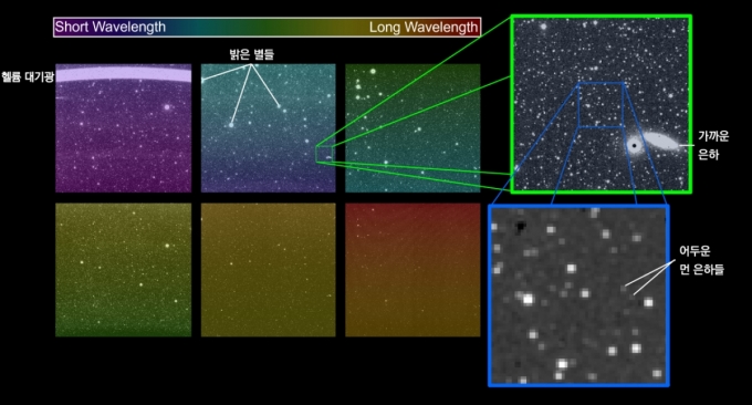 6컷의 이미지는 스피어엑스가 관측한 전체 시야를 보여준다. 짧은 파장은 보라색-파란색으로, 긴 파장은 초록색-붉은색으로 표현했다. 왼쪽 첫 번째 이미지 상단의 밝은 선은 지구 대기 헬륨에 의해 생겼다. 이미지 오른쪽 개별 표시된 두 상자 이미지는 원본을 확대한 이미지다. 더 크게 확대한 파란색 상자 이미지를 통해선 스피어엑스가 어둡고 먼 은하도 관측할 수 있음을 확인할 수 있다.