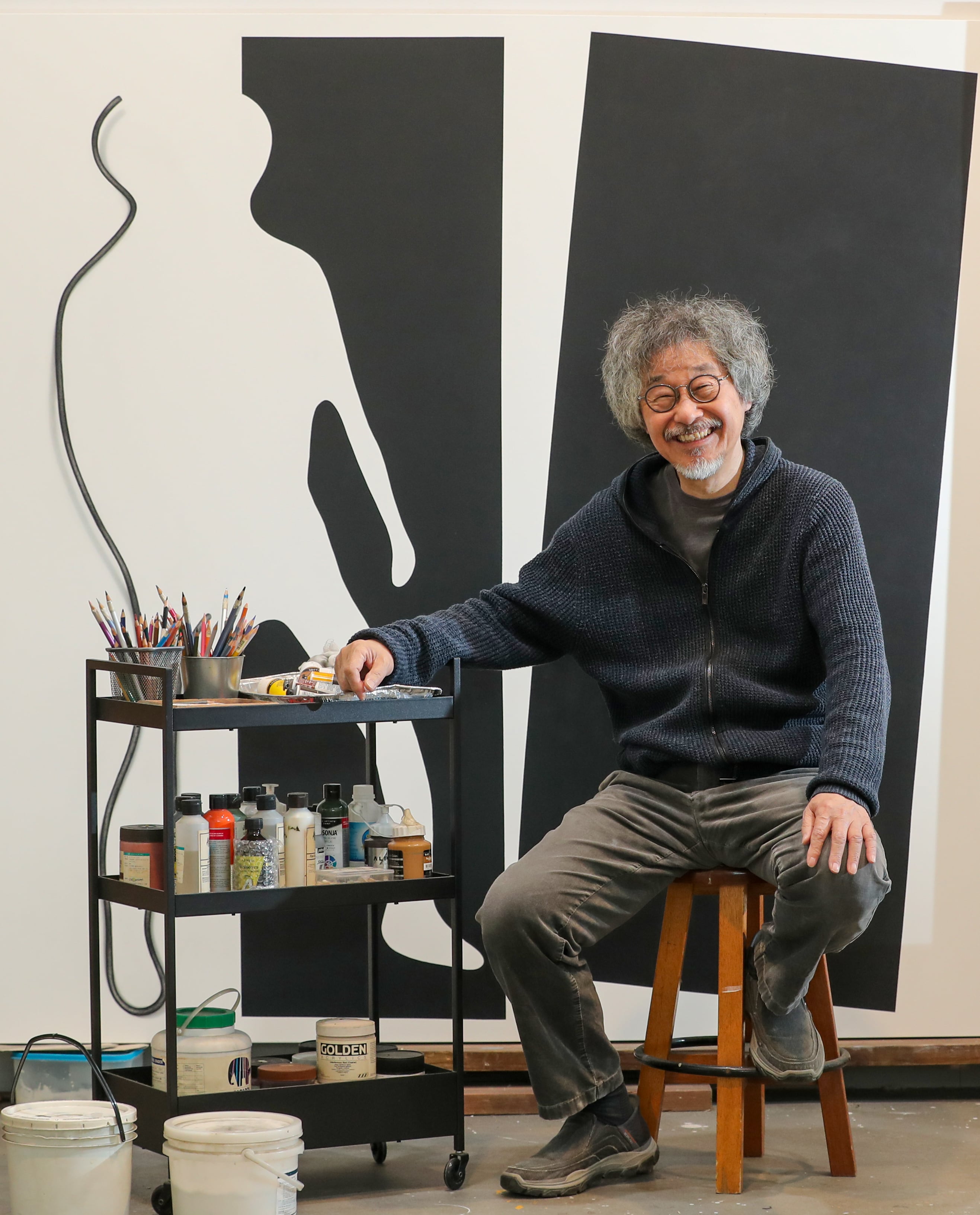 경기도 광주시 곤지암 작업실에 찾아갔을 땐 이사 준비가 한창이었다. 15년간 집과 화실을 겸하던 곳을 정리하고 서울로 옮길 작정이라고 했다. 대형 탁자 위에는 검은 실루엣이나 간결한 윤곽선으로 그린 갖가지 인간 군상들이 펼쳐져 있었다. 종이나 금속 판을 오려내 실루엣이나 그림자 형상을 만들고, 그것들을 그림으로 재조립해 작품을 만든다. 수상 소감을 묻자 그는 “좋은 작가가 많은데 늙은이한테 상을 줘서 무슨 소용 있나 싶다”면서도 “제 나름대로 평생 작업을 해왔는데 주목해 주는 사람이 있었구나 싶어 기쁘다”고 했다.