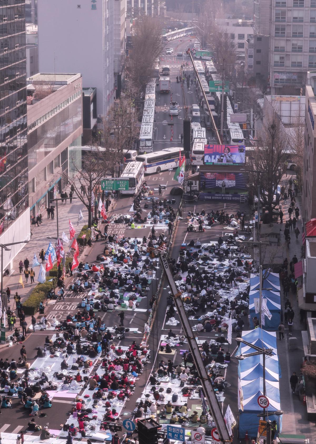 헌재 인근 안국역 앞 ‘찬탄’ ‘반탄’ 집회 헌법재판소의 윤석열 대통령 탄핵심판 선고를 이틀 앞둔 2일 서울 종로구 헌법재판소와 가까운 안국역 인근에서 탄핵 찬반 집회가 이어졌다. 윤석열 즉각퇴진·사회대개혁 비상행동은 윤 대통령 파면을 촉구하는 24시간 철야 집회를 벌였고(위쪽 사진), 자유통일당 등 윤 대통령 탄핵에 반대하는 보수 단체는 농성장에서 ‘탄핵 불가’를 외쳤다. 뉴시스·장승윤 기자 tomato99@donga.com |
