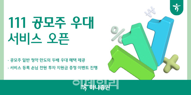 서비스 오픈 기념 이벤트도 진행한다. 6월 30일까지 111 공모주 우대 서비스에 등록한 고객 전원에게 최소 1000원에서 최대 111만원의 주식 투자 지원금을 랜덤 지급한다. 이벤트에 대한 자세한 사항은 하나증권 홈페이지와 모바일트레이딩시스템(MTS) 원큐프로 내 이벤트 페이지에서 확인 할 수 있다.