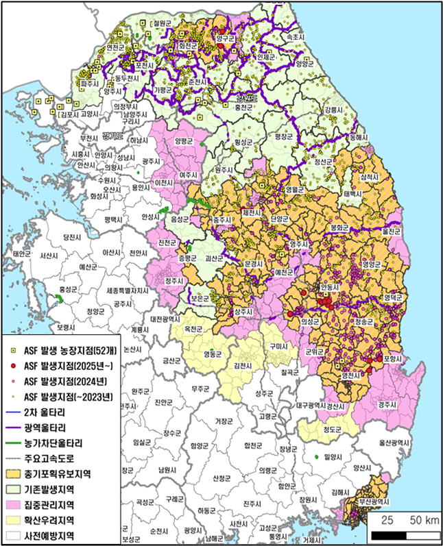 야생멧돼지 아프리카돼지열병 관리대책 지역도[환경부·농림축산식품부 자료] |