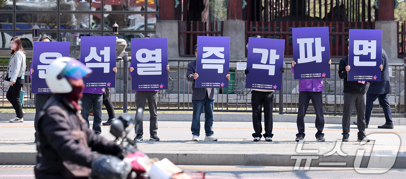 (서울=뉴스1) 김성진 기자 = 10.29 이태원 참사 유가족협의회 관계자들이 3일 서울 종로구 광화문광장 이순신 장군 동상 앞에서 윤석열 대통령 파면 촉구 피켓팅을 하고 있다. 2025.4.3/뉴스1