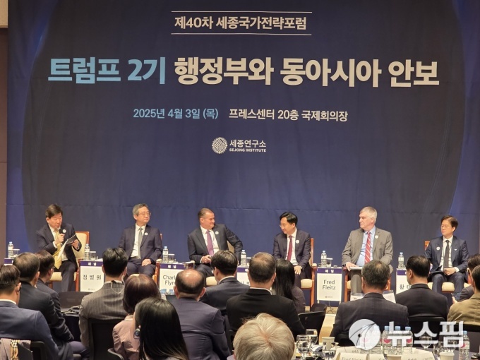 [서울=뉴스핌] 세종연구소가 3일 서울 세종로 한국프레스센터 국제회의장에서 개최한 세종국가전략포럼에서 김현욱 소장(왼쪽)이 제1세션 참석자를 소개하고 있다. 왼쪽부터 김 소장, 정병원 외교부 차관보, 찰스 플린 전 미태평양육군사령관, 신범철 세종연구소 수석연구위원, 프레드 플라이츠 미국우선주의정책연구소(AFPI) 부소장, 황태희 통일부 통일협력국장. [사진=이영종 기자] 2025.04.03 yjlee@newspim.com |