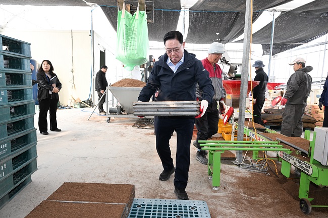 강수현 양주시장이 4월 2일 광적면 못자리 설치 현장을 방문해 힘들게 작업하고 있는 농업인들을 격려하고 직접 일손을 보탰다.