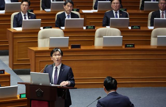 오동운 고위공직자범죄수사처(공수처)장이 3일 서울 여의도 국회에서 열린 제423회 국회(임시회) 제4차 본회의 경북·경남·울산지역 산불 사태 수습과 피해대책 마련 및 헌법질서 수호를 위한 긴급현안질문에서 장동혁 국민의힘 의원 질의에 답변하고 있다. 뉴시스 |