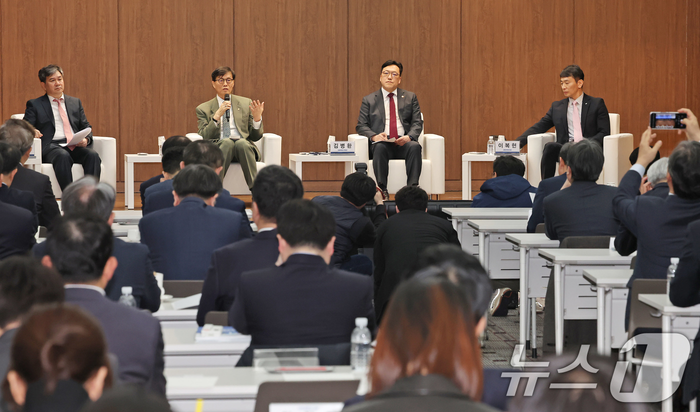 이창용 한국은행 총재가 3일 오후 서울 은행회관에서 열린 '한국은행-한국금융연구원 공동 정책 컨퍼런스' 특별 대담에서 발언하고 있다. 이번 컨퍼런스는 '부동산 신용집중: 현황, 문제점 그리고 개선 방안'을 주제로 진행됐다. 왼쪽부터 이항용 한국금융연구원 원장, 이창용 총재, 김병환 금융위원장, 이복현 금융감독원장. 2025.4.3/뉴스1 ⓒ News1 장수영 기자 |