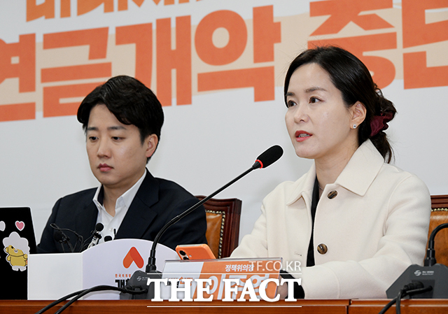 [더팩트ㅣ국회=배정한 기자] 이주영 개혁신당 의원(오른쪽)이 4일 오후 서울 여의도 국회에서 열린 비상최고위원회의에 참석해 모두발언을 하고 있다.