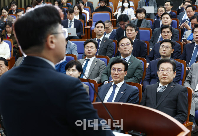 이재명 더불어민주당 대표가 4일 오후 서울 여의도 국회에서 열린 의원총회에서 박찬대 워내대표의 발언을 듣고 있다.(사진=뉴스1) |