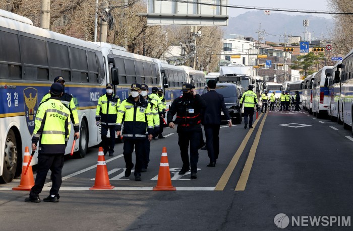 윤석열 전 대통령의 탄핵 심판 선고 날인 이날 경찰은 소요 사태를 대비해 이날 전국에 기동대 338개 부대 2만여명을 배치했다.