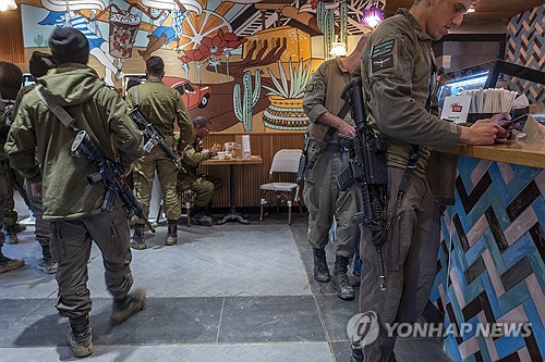 개인화기 소총을 메고 카페를 찾은 이스라엘 군인들 |