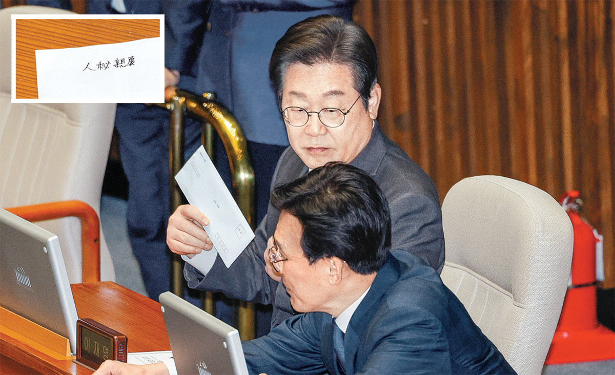 ‘인비친전’ 봉투 전달받는 이재명 더불어민주당 이재명 대표(위)가 4일 서울 국회 본회의에서 같은 당 김우영 의원으로부터 전달받은 봉투를 들고 있다. 봉투 겉면에 ‘인비친전’(비밀사항을 밀봉해 전달하는 형식·왼쪽 위 작은 사진)이라고 적혀 있어 대선 논의가 시작됐다는 해석이 나왔다. 뉴스1 |